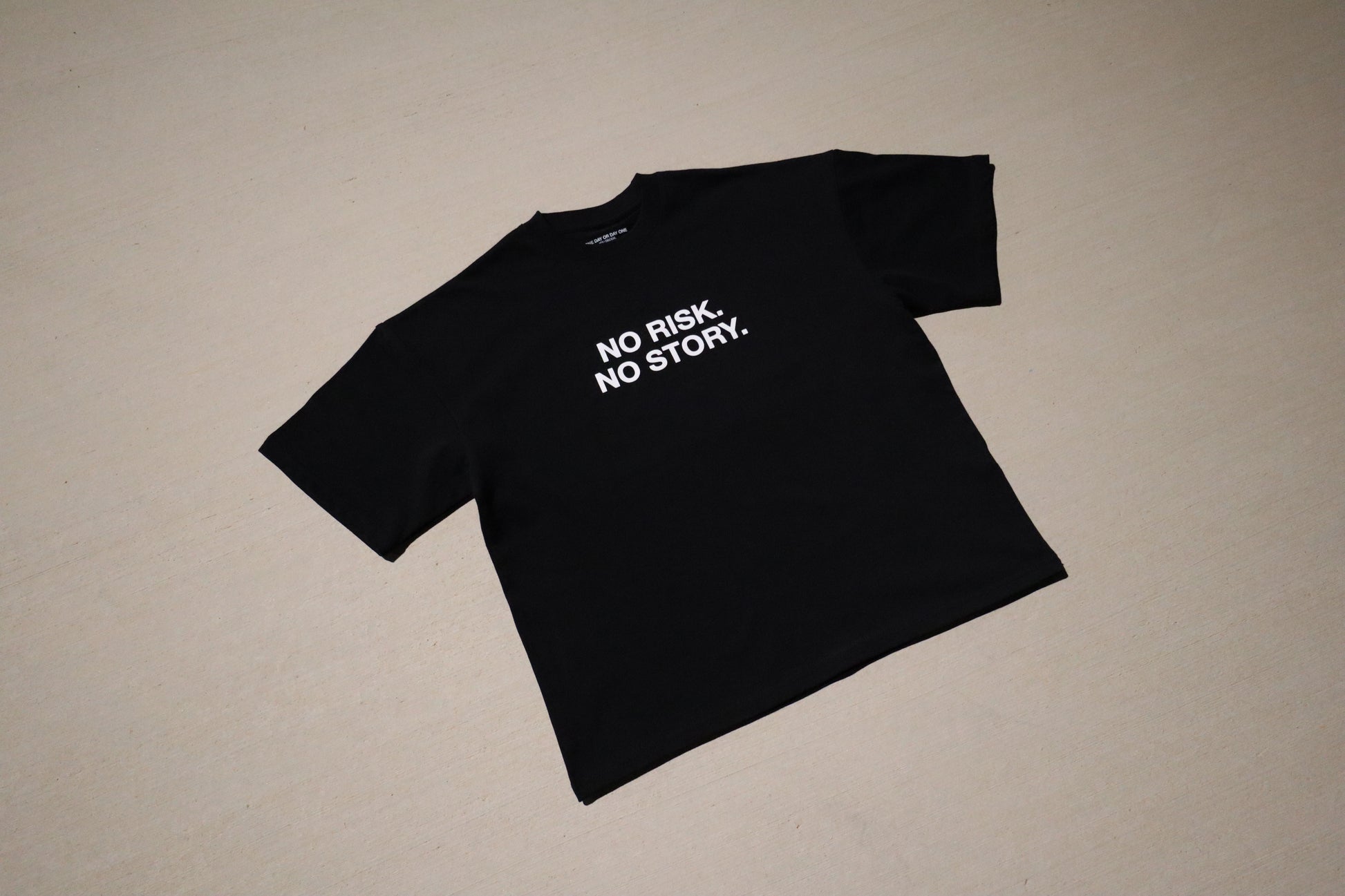 Classic, powerful, undeniable. The Black No Risk No Story tee is a reminder that every achievement starts with a leap of faith. White lettering stands out on a deep black canvas, making the message impossible to ignore. Comfortable, versatile, and motivational. It’s streetwear that speaks.